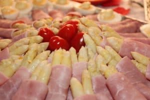 芦笋配什么吃?它最适合搭配香气四溢的腌制肉类和烤或烤土豆,以及其他蔬菜,如青椒或西红柿。芦笋的一种流行的食用方法是用火腿片或培根包起来。此外,还应该记得为他们准备精华酱料。